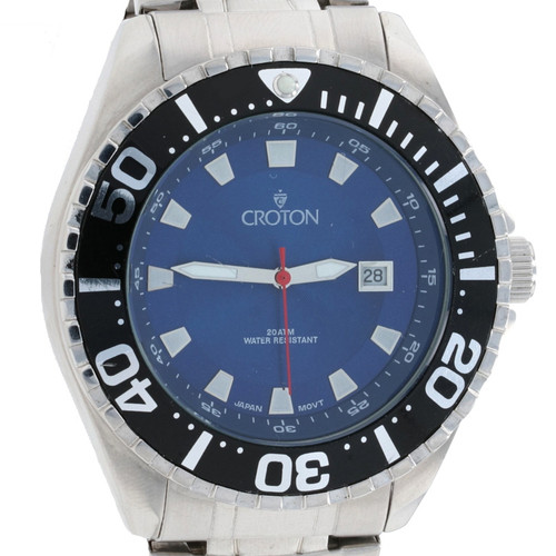 This great wristwatch is sure to please! This men's watch is a Croton piece with a Japan movement. The round face of the watch is done in a cobalt blue with white number markers in digits and bars. The face is framed by a well-numbered winding movement and has a crown on the right side. The Croton emblem is attached to the upper part of the face while the base is marked 20 ATM water resistant. The band, bezel, and back are all made of sturdy stainless steel with a beautiful brushed finish. The back of the movement is stamped "20 ATM Water Resistant All Stainless Steel Japan Movt". The large chain style strap is secured with a deployment clasp which is also stamped "Stainless Steel".