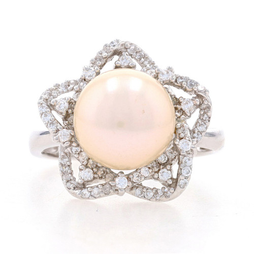 New Pink Cultured Pearl & CZ Star Flower Halo Ring - Sterling Silver 925 Size 7