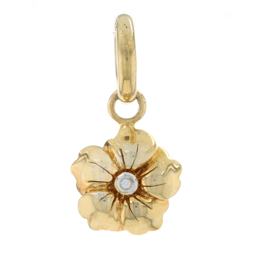 This great charm is a Story Element number 5208819 by Kranz & Ziegler. The drop charm features detailed flower accented by a cubic zirconia center piece. The back is stamped 925 Story CZ. As can be seen in the photographs, the gold plating displays some loss but it does not detract from this piece's overall beauty or functionality.