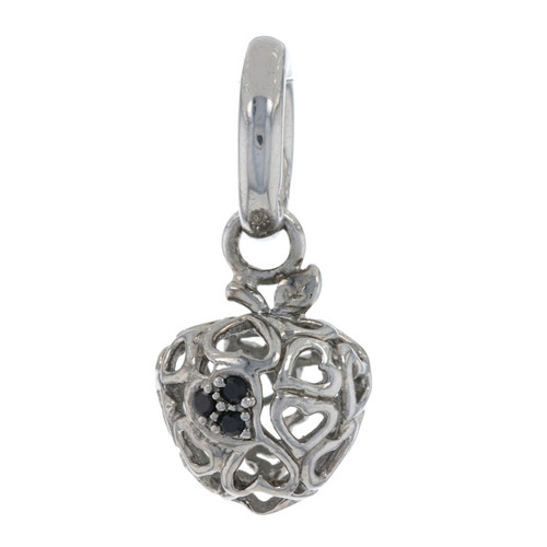 This great NEW charm is a Story Element number 5208820 by Kranz & Ziegler. The apple charm features a drop design accented by heart cutouts and solid heart set with shimmering black cubic zirconias. The bail is stamped 925 CZ Story.