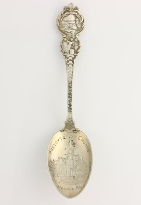 Wayne Nebraska Souvenir Spoon - Sterling Silver Presbyterian Church State Seal