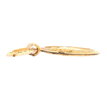This vintage stamp case has a superb design that would make it a fine addition to any collection! The case is made of sterling silver and features a patterned design on the front, and a smooth, polished finish on the back. Yellow and rose gold stripes accent the front of the case and are set on either side of a raised fraternal emblem. The emblem is finished with white, blue and red enamel; but, does show some slight wear. The back of the case is engraved with the monogram LDJ in side of a diamond shaped border. While the case opens and closes securely and tightly, there is a slight gap between the front and back sides of the case when it is closed shut. The inside of the case has a smooth, polished finish and both sides are fitted with a curved bar to hold stamps or a photograph. One of the bars is not fully attached to the case but is still in working order. When we acquired this fine piece, a vintage photograph portraying a woman and a child was held inside. The photograph is included with this special piece. There is some light surface scratching on the inside of the case. The back of the case is marked Sterling and 14k Gold for it's purity composition.