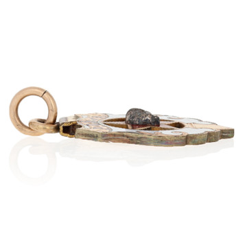 This vintage fob features a skull and cross boned set atop a cross. The skull is set with red glass eyes. Either side displays a FCB shield emblem in colorful enameling. There is some tonal wear and surface scratching.