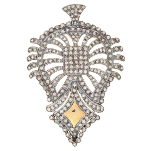 Give your favorite dress-up ensembles an exotic new look with this eye-catching pendant! Fashioned in sterling silver with a diamond-shaped 14k yellow gold plated accent, this piece is a large leaf adorned with natural golden-hued diamonds on a black-embossed background. The back of the pendant is gold-plated and includes a generously-sized bail that will accommodate a chain.