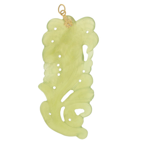 This lovely Asian inspired pendant features a carved light green serpentine stone. The stone is carved in fine detailing. The flower is topped with a gold plated flower and jump ring.