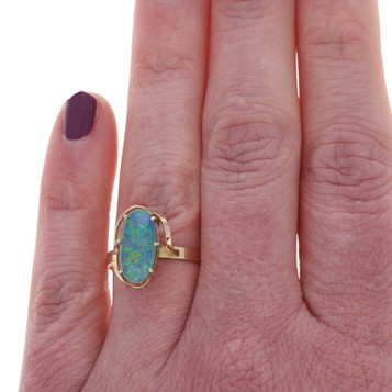 Quick view Wilson Brothers Jewelry Yellow Gold Opal Vintage Cocktail Solitaire Ring - 9k Oval Triplet Size: 8Sizing Fee: Up 3 sizes for $40 or Down 2 sizes for $30Era: VintageMetal Content: 9k Yellow GoldStone InformationNatural OpalCut: Oval TripletStyle: Cocktail SolitaireMeasurementsFace Height... MSRP: $359.99 Add to Wish List Compare