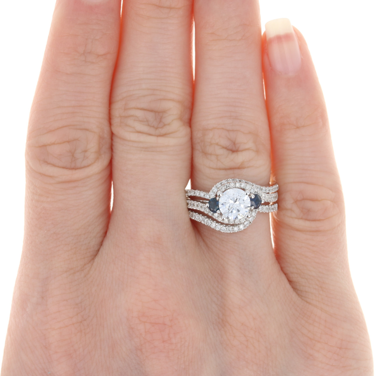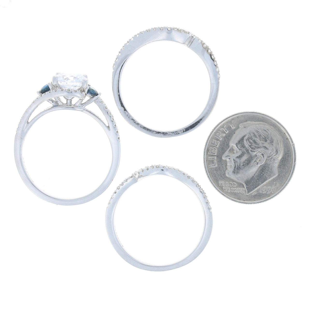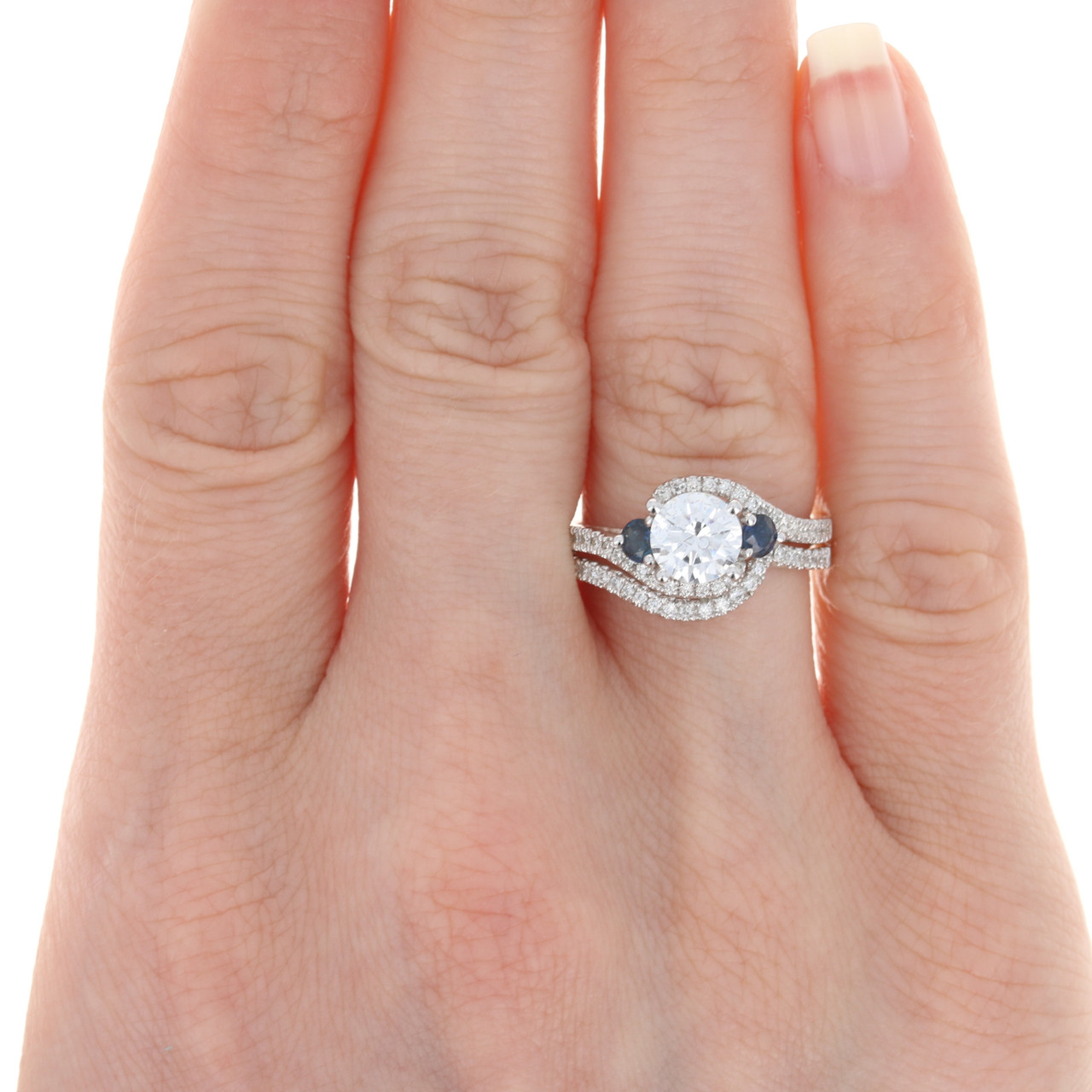 Showcase your perfect diamond or heirloom gemstone in this NEW three-piece wedding set by Scott Kay. Fashioned in popular 14k white gold, the set features an elegant, bypass-style engagement ring with a raised semi-mount for a 6.5mm diamond or gemstone. Two sapphires and an array of diamond accents adorn the sides of the engagement ring, which nestles in the center of two contoured guard bands.