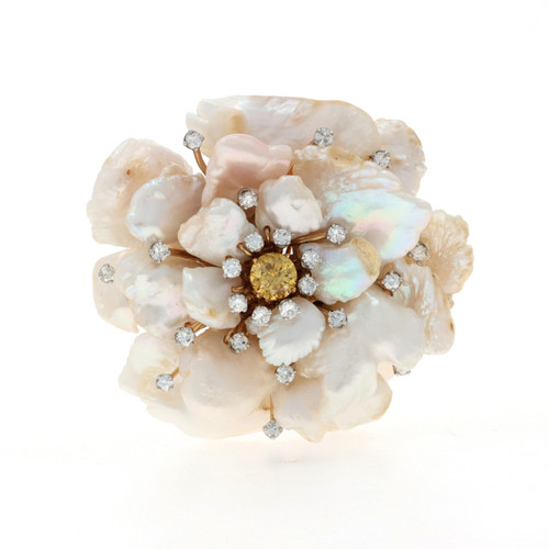 Ruser Diamond Baroque Pearl Vintage Flower Brooch Gold 14k Plat 1.23ctw GIA Pin