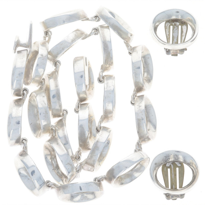 Sterling Silver Circle Link Stud Earrings & Necklace Set 16" 925 Clip-Ons