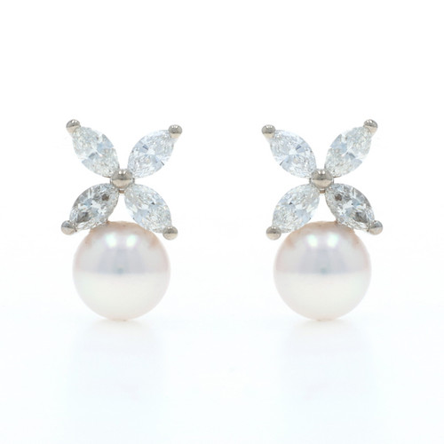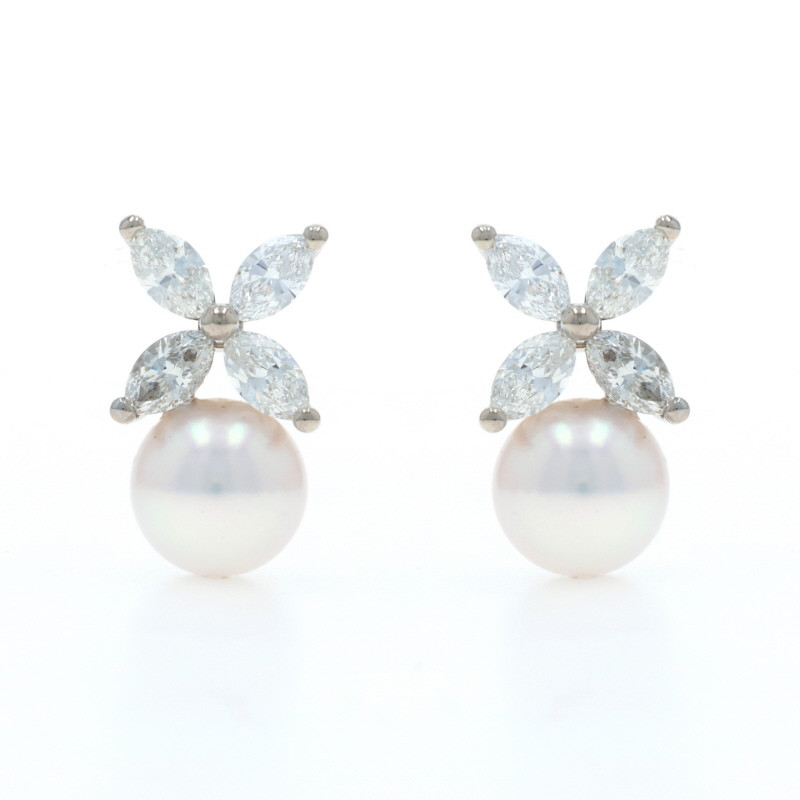 White Gold Akoya Pearl Diamond Short Drop Earrings - 18k 1.28ctw Pierced