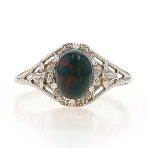 White Gold Bloodstone Art Deco Solitaire Ring -10k Oval Cabochon Flowers Vintage