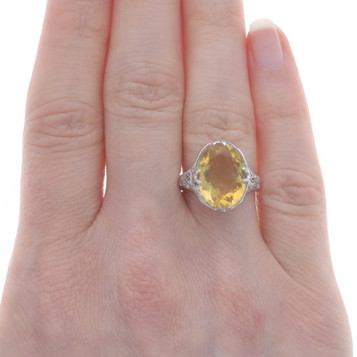 White Gold Citrine Art Deco Style Cocktail Solitaire Ring - 10k Oval Filligree