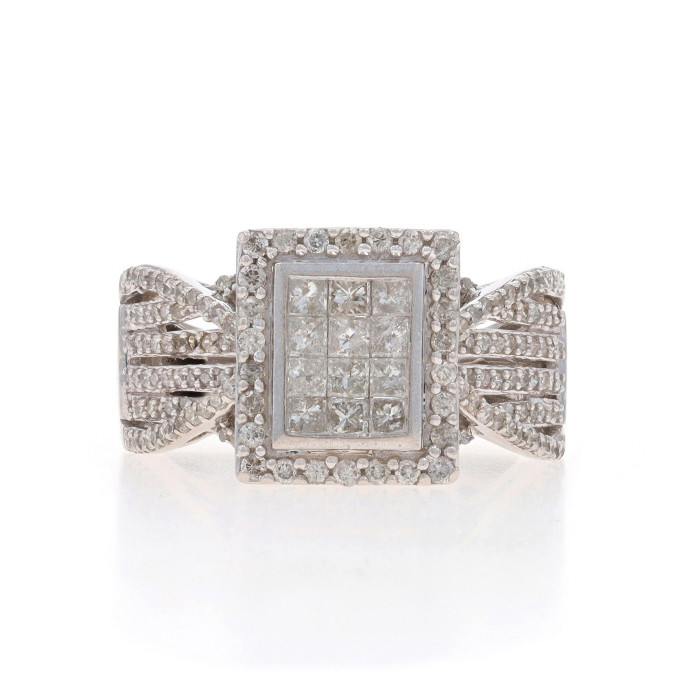 White Gold Diamond Cluster Halo Ring - 10k Princess & Single 1.00ctw