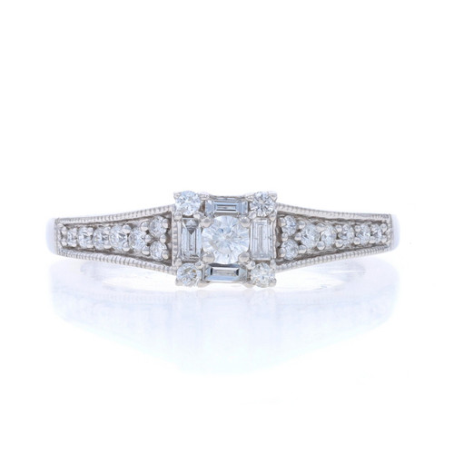 White Gold Diamond Halo Engagement Ring - 10k Round and Baguette .60ctw Milgrain