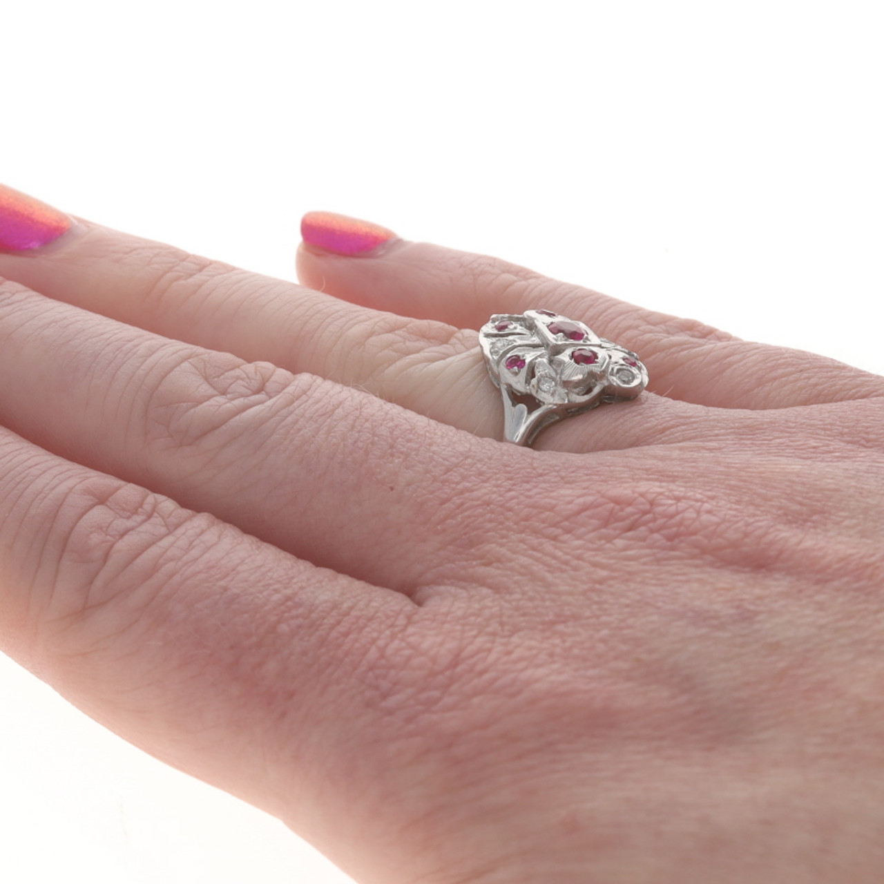 White Gold Lab-Created Ruby Diamond Art Deco Cocktail Ring 14k Rd .78ctw Vintage