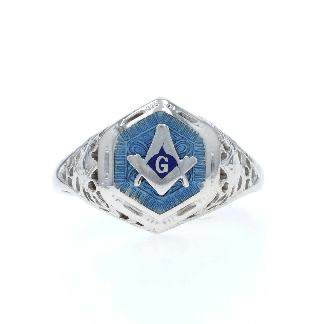 White Gold Masonic Blue Lodge Sweetheart"s Ring - 10k Blue Enamel SZ 6
