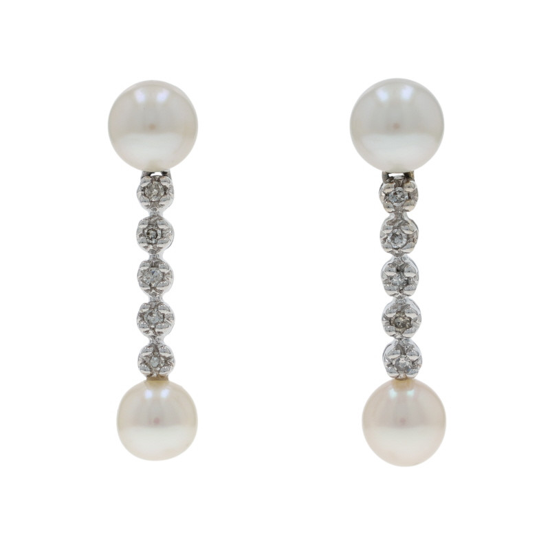 White Gold Pearl Diamond Dangle Earrings - 14k .10ctw Pierced