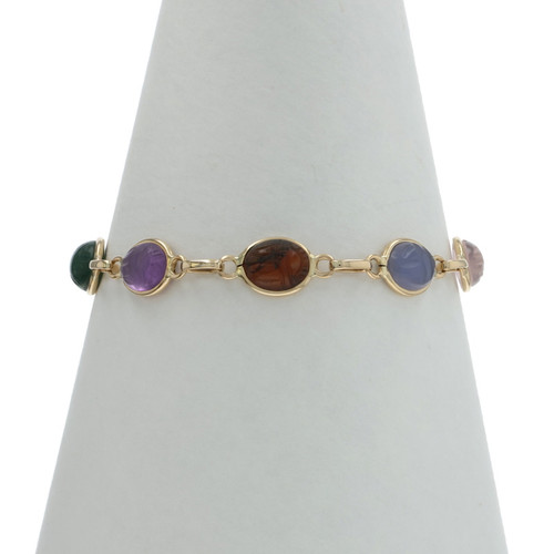 Yellow Gold Agate Aventurine Quartz Vintage Link Bracelet 7 1/2" - 14k Scarab