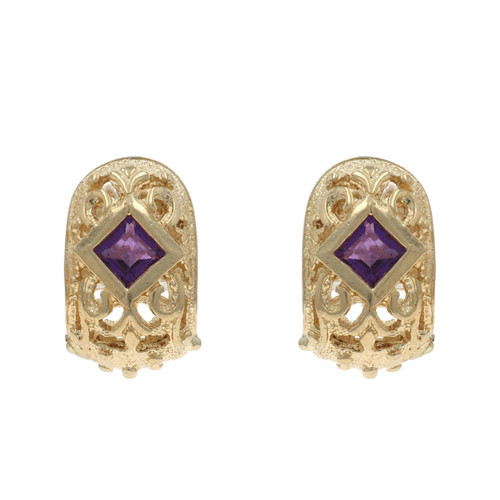 Yellow Gold Amethyst Scroll Huggie Hoop Earrings 14k Square .40ctw Pierced