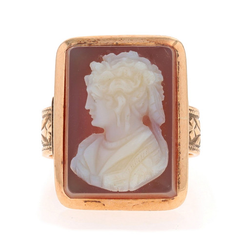 Yellow Gold Carved Banded Agate Cameo Victorian Ring - 10k Antique