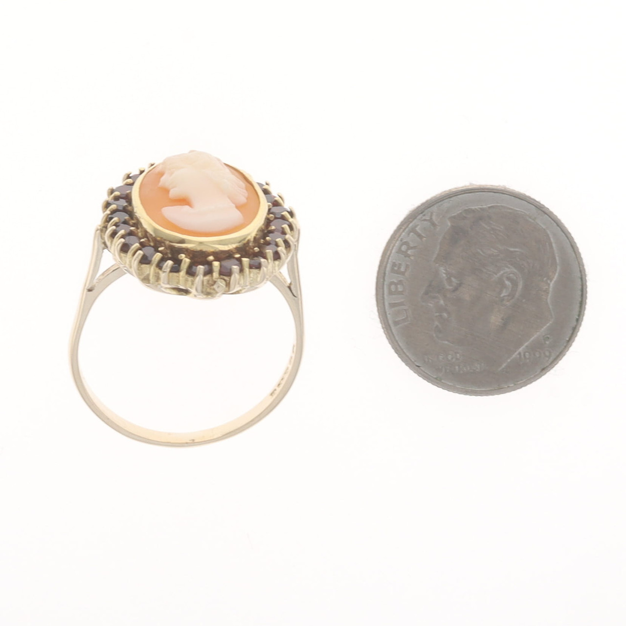 Yellow Gold Carved Shell Cameo Garnet Halo Ring - 10k 1.68ctw Silhouette