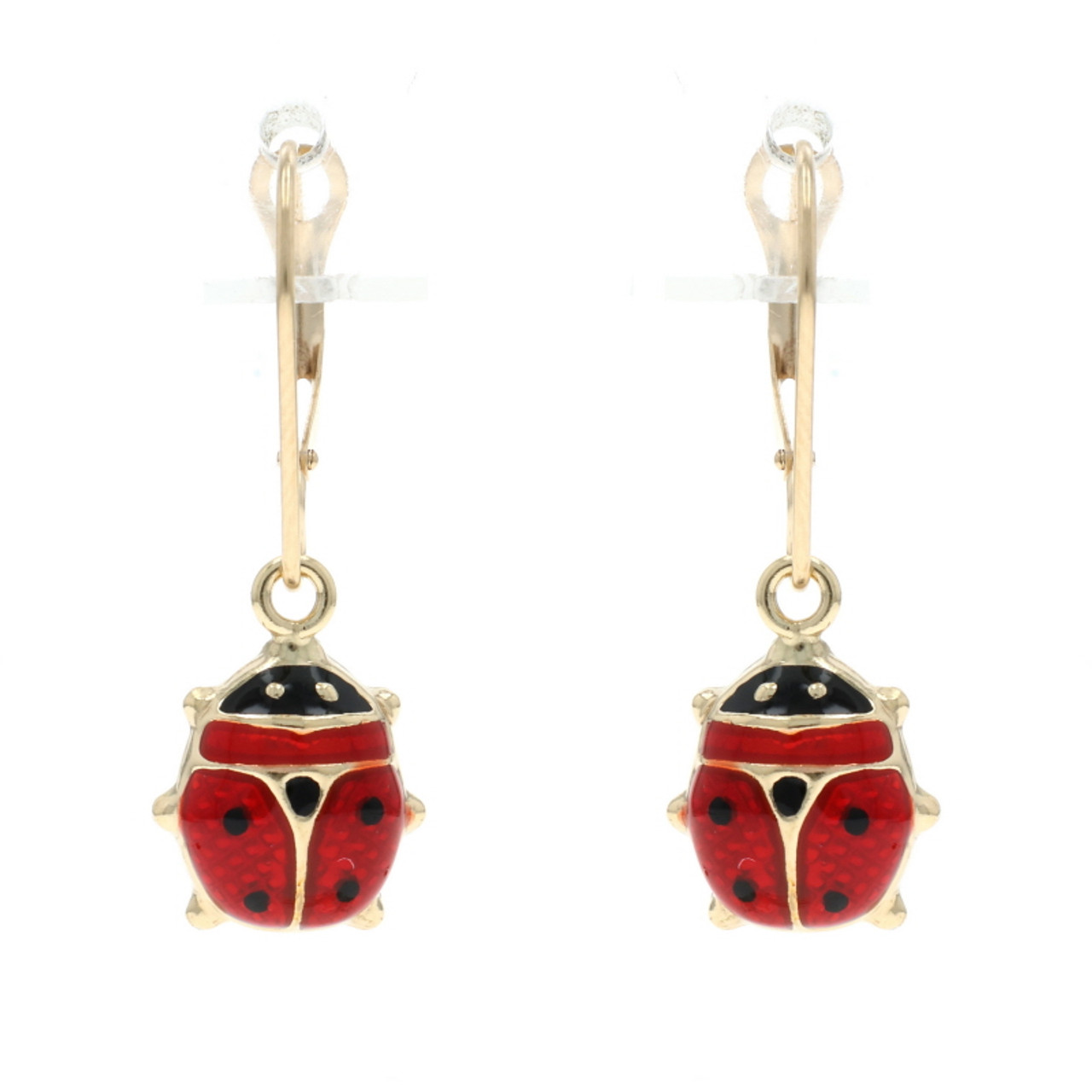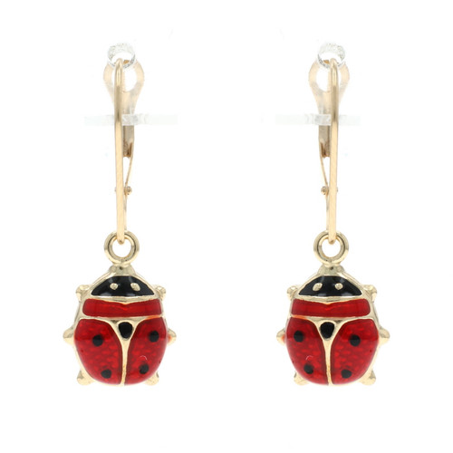 Yellow Gold Enamel Ladybug Dangle Earrings - 14k Good Luck Insects Pierced