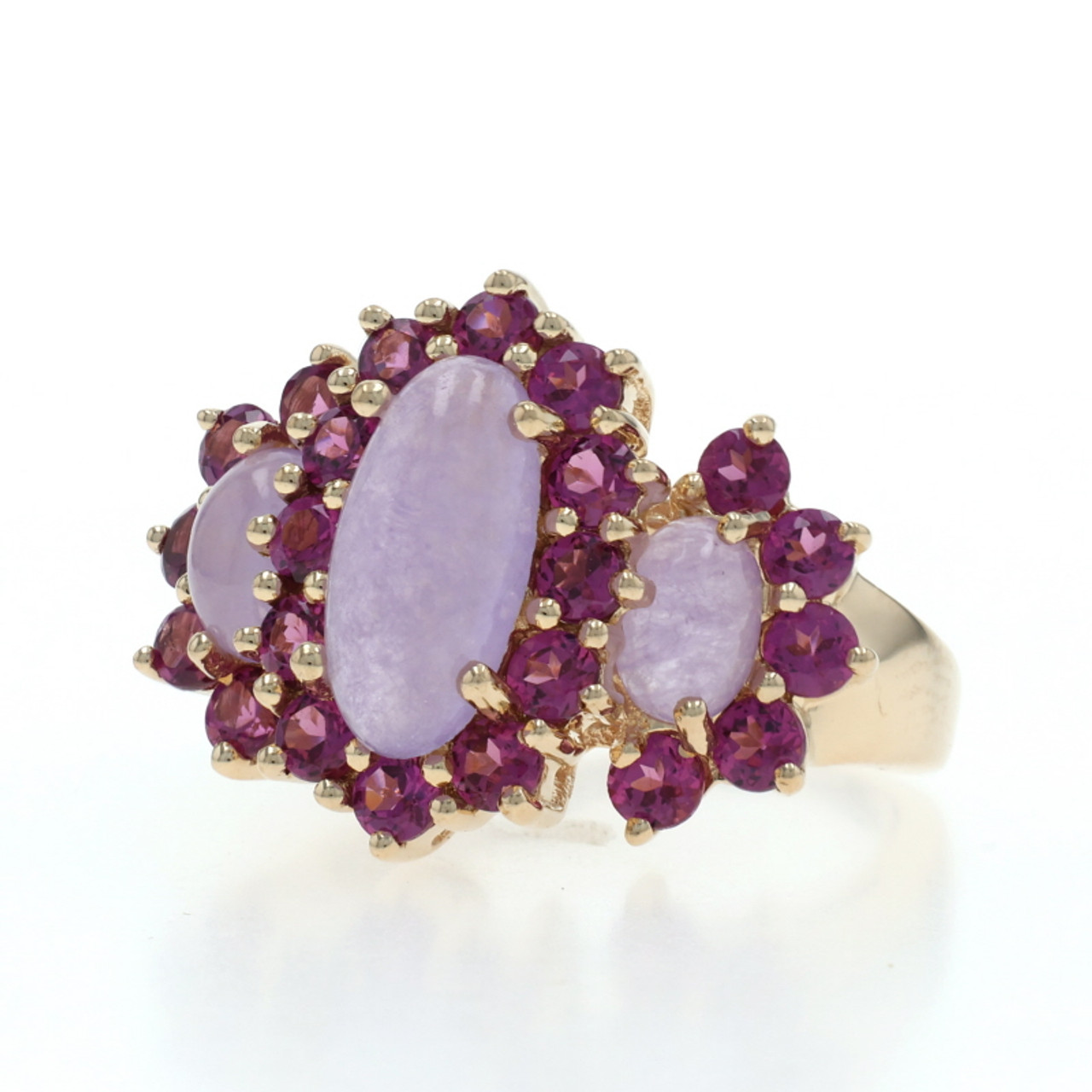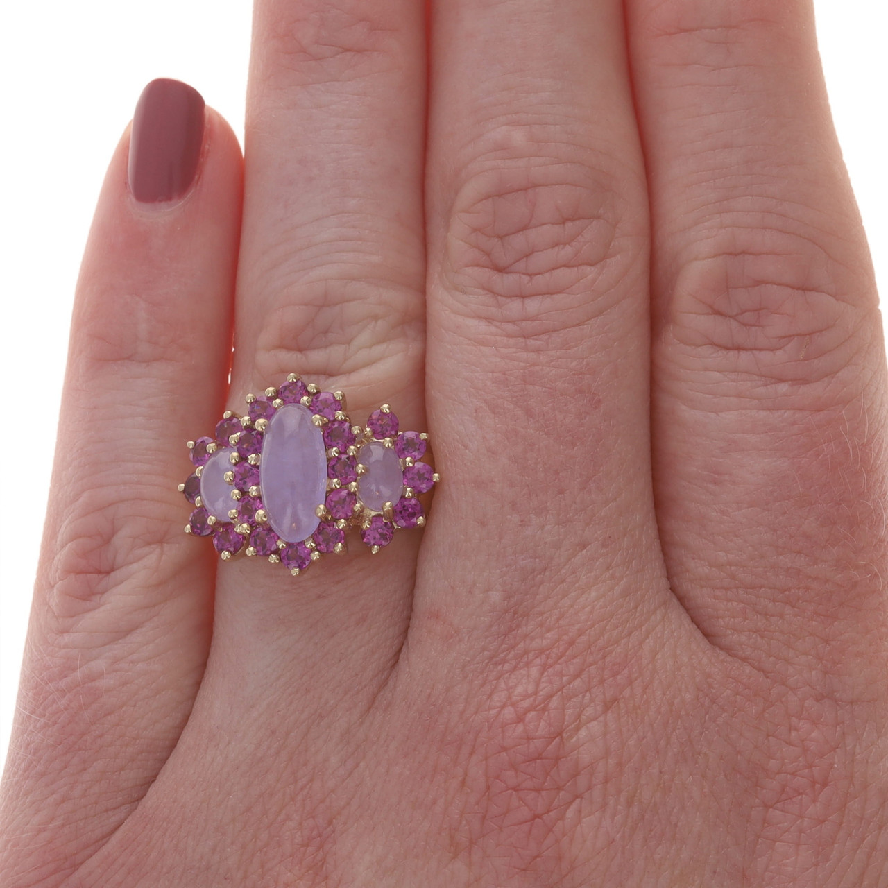 Yellow Gold Jadeite Rhodolite Garnet Three-Stone Halo Ring 14k Oval Cab 5.50ctw