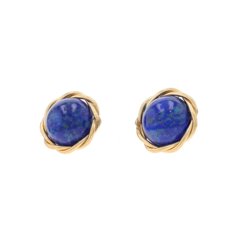 Yellow Gold Lapis Lazuli Stud Earrings - 14k Round Cabochon Rope Twist Pierced