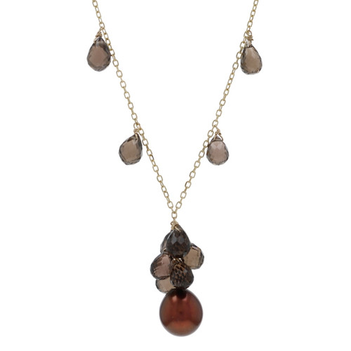 Yellow Gold Pearl Smoky Quartz Dangle Necklace 17" - 14k Bead 12.00ctw Treated