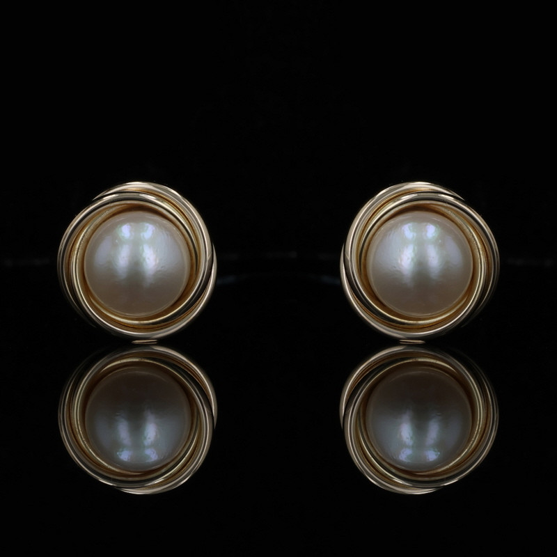 Yellow Gold Pearl Stud Earrings - 14k Intertwined Circles Pierced