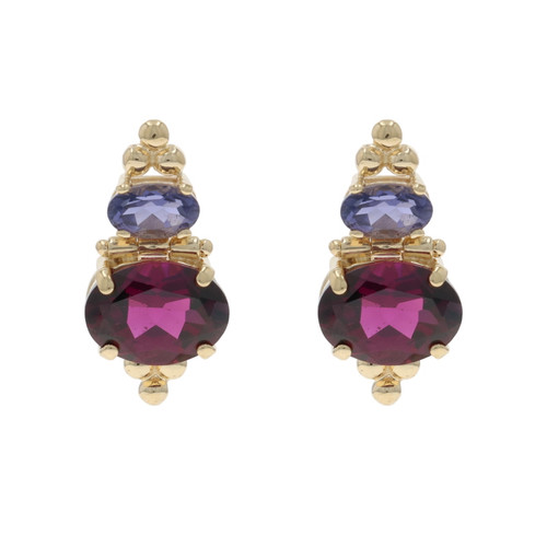 Yellow Gold Rhodolite Garnet Tanzanite Drop Earrings - 14k Oval 3.20ctw Pierced