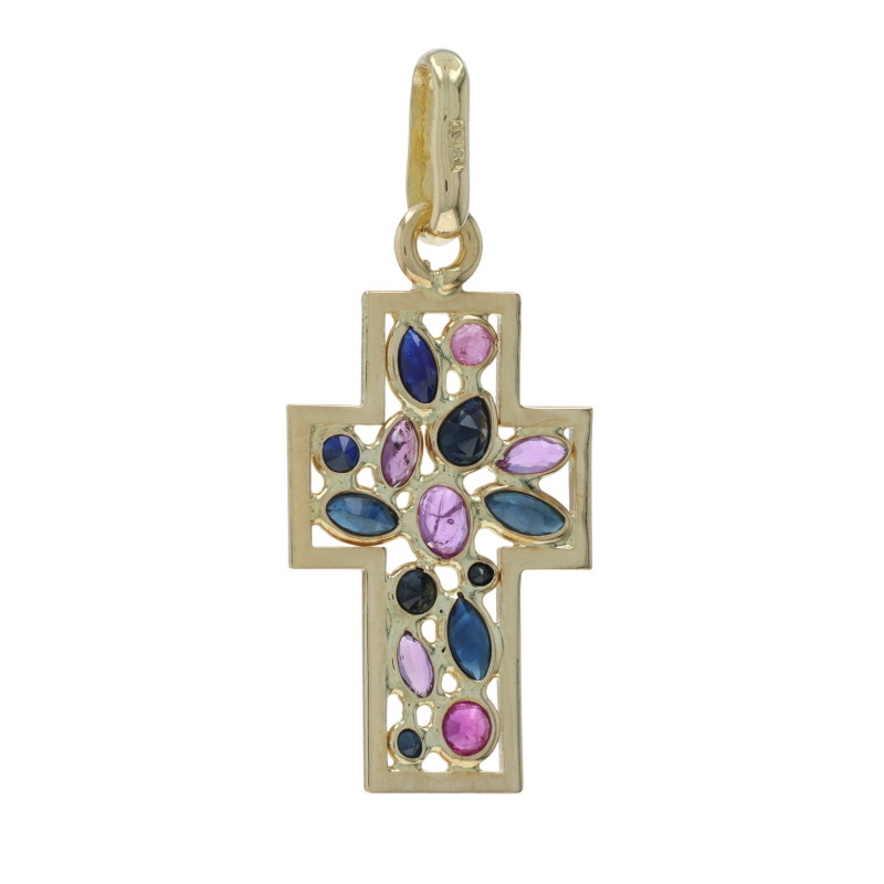 Yellow Gold Ruby Sapphire Cross Pendant - 18k Oval Round Marquise 1.63ctw Faith