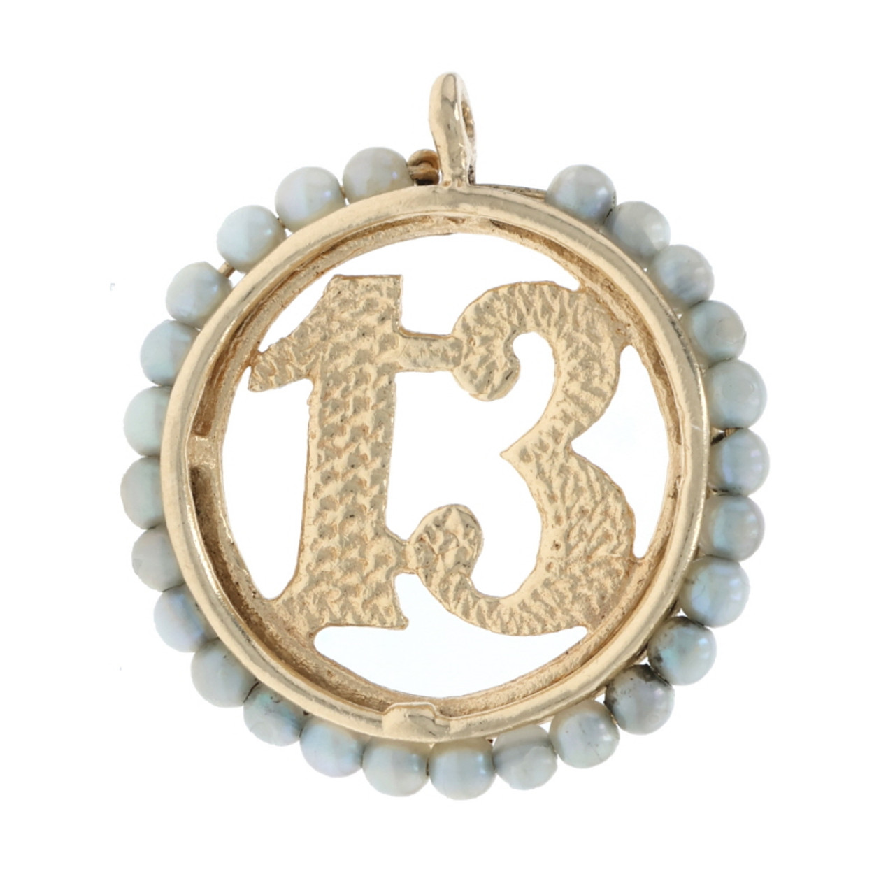 Yellow Gold Simulated Pearl Vintage 13 Charm -14k Lucky Number Birthday Pendant