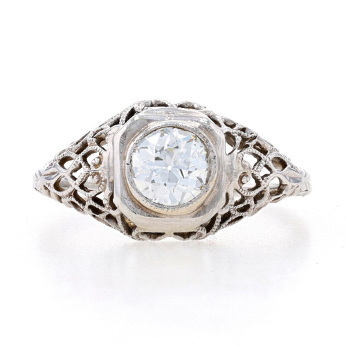 Celebrate the timelessness of true love and commitment with a vintage engagement ring! This gorgeous Art Deco piece dates from the 1920s - 1930s, an era known for its innovative designs and attention to detail, characteristics beautifully represented in this ring. Created in 14k white gold, the ring showcases a European Cut natural diamond solitaire of .59 carat weight, VS1 clarity, and I color. For enhanced brilliance and sparkle, an open port on the underside of the bezel-set solitaire allows light to flow freely through the stone. Displaying the artistic skill of its Art Deco designer, the shoulders and sides of the ring are adorned with a filigree design crafted from beaded and textured white gold. The ring's shank is smoothly polished on both the interior and exterior surfaces and contoured for a comfortable fit. In pristine condition, this Art Deco engagement ring is the perfect way to carry forward the tradition of lifetime love and commitment! The ring's 14k gold purity composition has been professionally tested and verified.