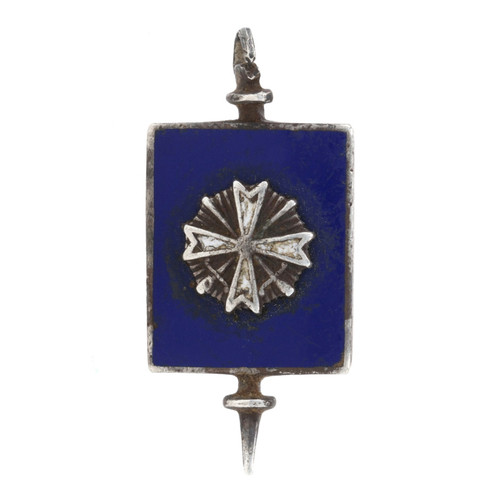 This vintage fob charm is a Blue Honor Key. The key features a Maltese cross against a ray-like design with two crossed swords behind the cross. This symbol representing DeMolay is atop a blue enamel rectangle. This key fob is very old and has much patina and surface scratching on the back. The front enamel is loosing it's luster and is also scratched in some places. it appears the number "1120" was engraved on the back of the key. It has also been stamped Sterling for silver purity. A helpful eBayer informed us that this key is given to members who secure at least 10 members and that this is an older, possibly 1950s version.
