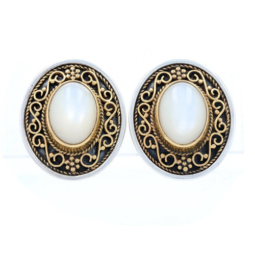Bold and beautiful, these stunning earrings by Konstantino are sure to delight! These sterling silver clip-on stud earrings feature an eye-catching oval silhouette adorned with luminous mother of pearl gemstones surrounded by 22k yellow gold rope and scrollwork borders.