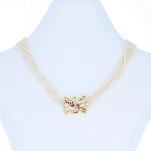 Five-Strand Cultured Pearl Necklace - 18k Yellow Gold Rubies & Diamonds 1.05ctw
