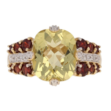 Make this gorgeous ring the highlight of a special birthday or milestone anniversary! Fashioned in 14k yellow gold, this NEW piece features a beautifully-faceted green quartz solitaire. Diamond accents set in beads of 14k white gold encircle the mounting and adorn the shoulders of the band, which are bordered on the top and bottom with 12 wine-red garnets.