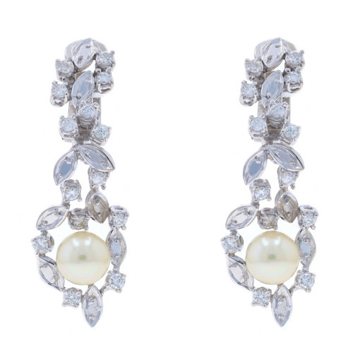Platinum Cultured Pearl & Diamond Vine Dangle Earrings - .84ctw Leaves Clip-Ons