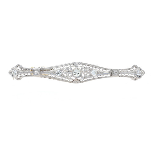 Platinum & Gold Diamond Art Deco Bar Brooch 14k Euro .42ctw Vintage Filigree Pin