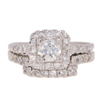 Art Deco splendor! Dating back to the 1930s - 1940s, this platinum bridal set showcases a halo engagement ring and a matching guard-style enhancer wedding band that are both adorned with sparkling white diamonds.