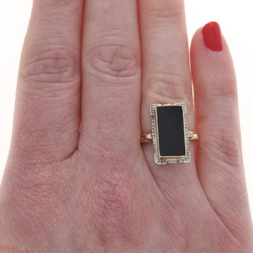 Size: 6Sizing Fee: Up 2 sizes for $40 or Down 1 size for $30Era: VintageMetal Content: 10k Yellow GoldStone InformationNatural OnyxStyle: SignetFeatures: Milgrain and Etched Detailing Around Shoulders & MountingMeasurementsFace Height (north to south):...