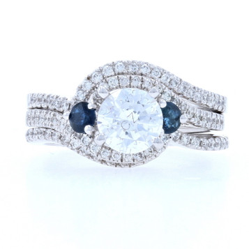 Showcase your perfect diamond or heirloom gemstone in this NEW three-piece wedding set by Scott Kay. Fashioned in popular 14k white gold, the set features an elegant, bypass-style engagement ring with a raised semi-mount for a 6.5mm diamond or gemstone. Two sapphires and an array of diamond accents adorn the sides of the engagement ring, which nestles in the center of two contoured guard bands.