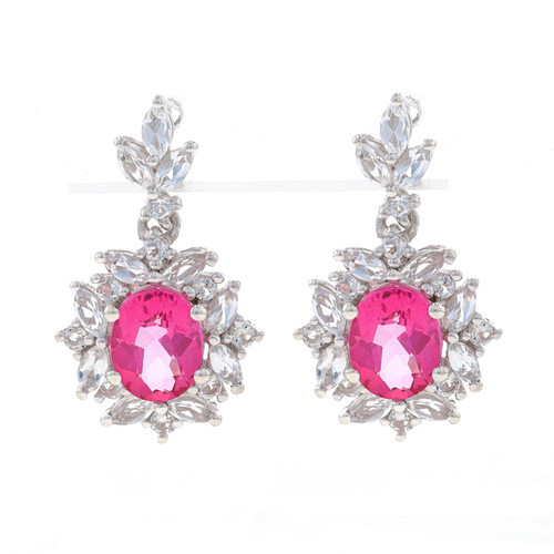 Sterling Pink & White Topaz Halo Dangle Earrings - 925 Oval 7.10ctw Flowers