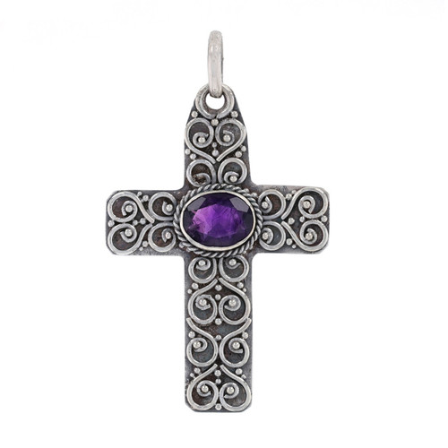 Sterling Silver Amethyst Scrollwork Cross Pendant - 925 Oval 2.40ct Faith