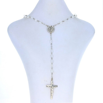 Encourage a friend in her spiritual walk when you give her this beautiful rosary. Created in sterling silver, this vintage rosary includes beads of clear crystal and features a pendant bearing the image of Mother Mary on one side and the Sacred Heart on the other. The cross is missing from the bottom of the necklace, but is waiting for your personalized crucifix to be attached! This rosary is an original Creed design and the back of both pendants are stamped for metal purity and bear the Creed maker's mark. In great condition, this rosary would make a heart-touching gift for a special friend or spiritual mentor.