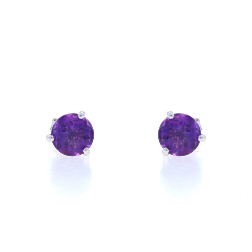 White Gold Amethyst Stud Earrings - 14k Round Checkerboard 1.40ctw Pierced