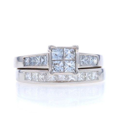 White Gold Diamond Cluster Engagement Ring & Wedding Band - 14k Princess 1.50ctw