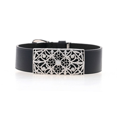White Gold Diamond Floral Filigree Bracelet -18k Rnd .12ctw Adjust Leather Strap