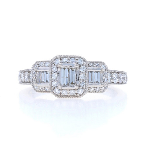 White Gold Diamond Halo Engagement Ring - 14k Round & Baguette .75ctw IGI